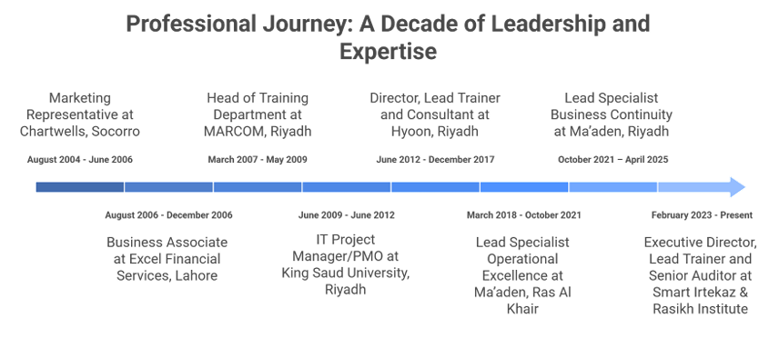 Adnan Rafique Ahmed is a US graduate, Executive Director, and Certified Trainer with over 20 years of expertise in Business Continuity, Risk Management, and Operational Excellence. He has delivered high impact training to more than 2,000 professionals across government, banking, mining, and corporate sectors in KSA, UAE, and beyond. Adnan is a Certified PECB Trainer for ISO 22301 and holds credentials including PMP, Lean Six Sigma Master Black Belt, and Balanced Scorecard Professional. Recognized repeatedly as a top trainer and consultant, he specializes in empowering professionals through practical, result-driven learning.